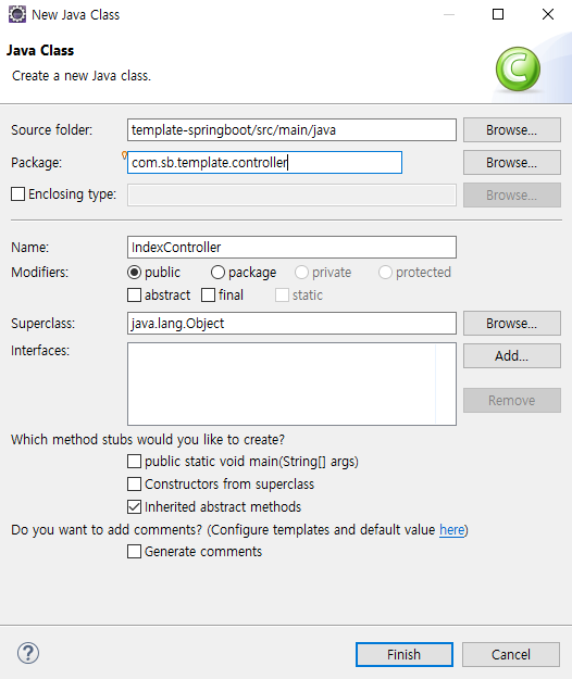 src/main/java의 com.sb.template 패키지에서 마우스우클릭 -> New -> Class를 선택
