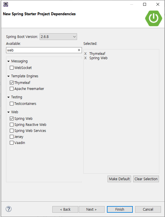 화면의 표시를 위한 템플릿엔진인 Thymeleaf, 그리고 웹 개발을 위한 Spring Web을 선택해줍니다.